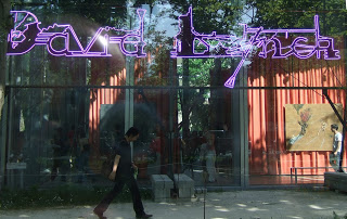 A few weeks ago I went to the Fondation Cartier to see their exhibition of David Lynch’s work, “The Air is on Fire”. (The Fondation Cartier building is a beautiful structure with an enormous glass facade, like perhaps something from one of Calvino’s “Invisible Cities”.) The entire exhibition space has been given over to Mr. Lynch’s works: upstairs there are paintings and drawings; downstairs there are photographs as well as a small cinema designed by Lynch himself. The cinema shows continuously a series of short films from early in Lynch’s career.
