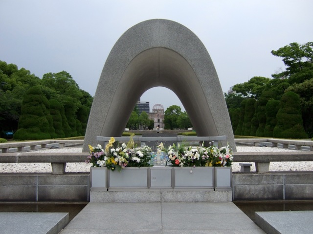 I spent a few hours in the museum, listened to all the audio commentary, looked at all the exhibits. Then I left for the park and walked to the cenotaph in the centre of the park. Standing before the memorial for the victims of the explosion, a curving, undulating arch, one sees in a direct line under the arch the burning flame, the flame that was lit that day in August in 1945, and beyond that charred structure of the “A-bomb dome”, one of the few buildings left standing after the explosion. It was only at that instant that I realised, fully, that those events described in the museum didn’t happen in some abstract place far away. They happened here, on the ground I was standing on.