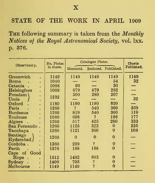 But getting back to the “carte du ciel”… There is the interesting table I have reproduced below, which shows the state of survey after ten years of operations, divided by into catalogue plates (the shallower survey) and “charts published” which are reproductions of the deeper survey plates.