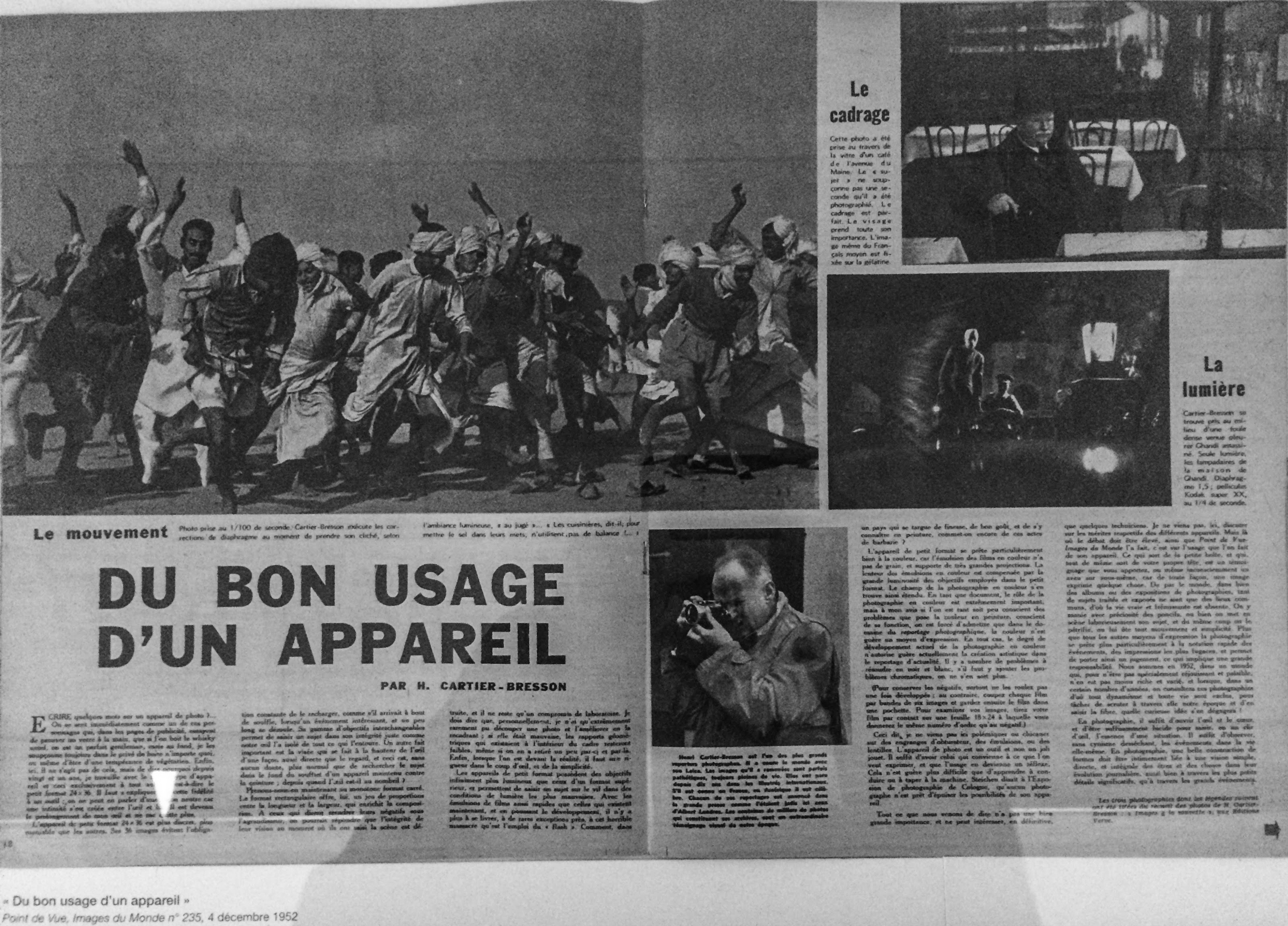 Moreover, there is no special reason that film photographers should not not suffer from the same equipment-malaise afflicting some digital photographers today. The image below is from a 1952 newspaper I saw in a recent show, where Cartier-Bresson reluctantly explains his philosophy in taking pictures (if you can read the captions they are particularly amusing to us today, especially about how to take pictures at night with very slow film, I think of all those people who complain that their highly sensitive digital cameras are not sensitive enough):