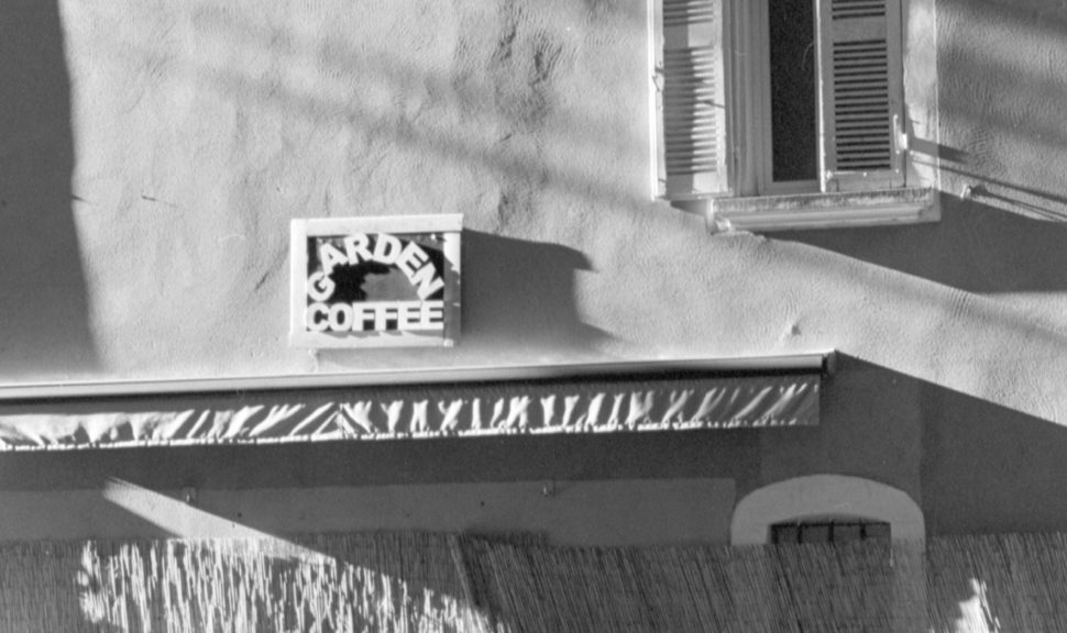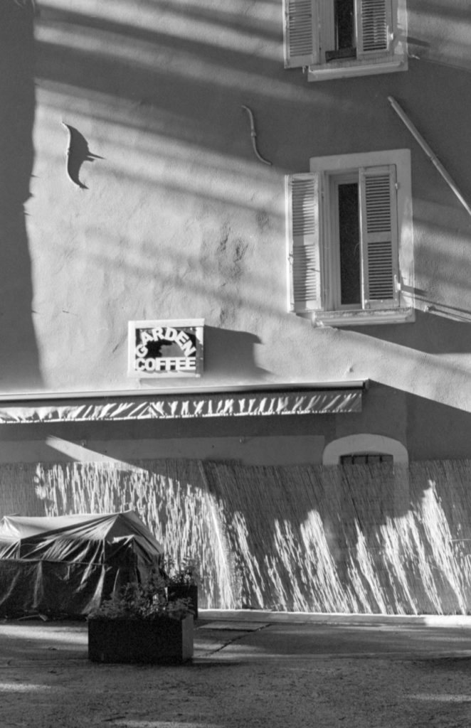 Yes, now I am travelling again after a long period in Paris. I spent one night in Grenoble (where I saw an old friend again after a long time) and in the morning early before my meeting I walked around looking for what could be a photograph. Grenoble is a strange place, there is an inner core of old buildings, surrounded by a larger layer of 70s-era tower-blocks, and beyond that the mountains. On a June morning like this one it’s a pleasant enough place. But here’s no photographs of buildings and mountains, just sunlight grazing a building sometime in the early morning. Garden coffee